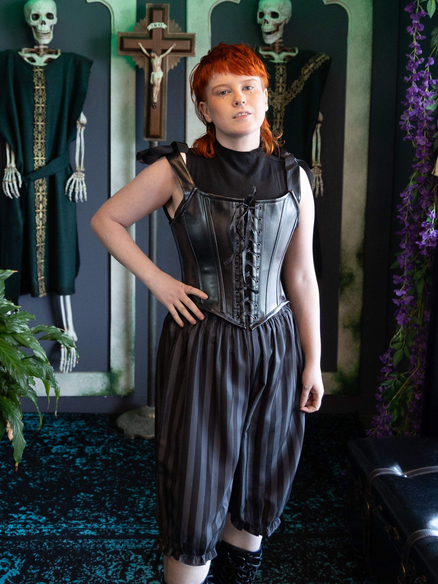 Regular price $45.00Make a bold statement with these poly-crepe long striped bloomers, a timeless piece with a playful twist. The vertical stripes elongate the silhouette while keeping the look fun and theatrical. Designed with an elastic waistband for comfort and ribbon-tied hems for adjustability, these bloomers are perfect for costumes, cosplay, festivals, or everyday alternative fashion.