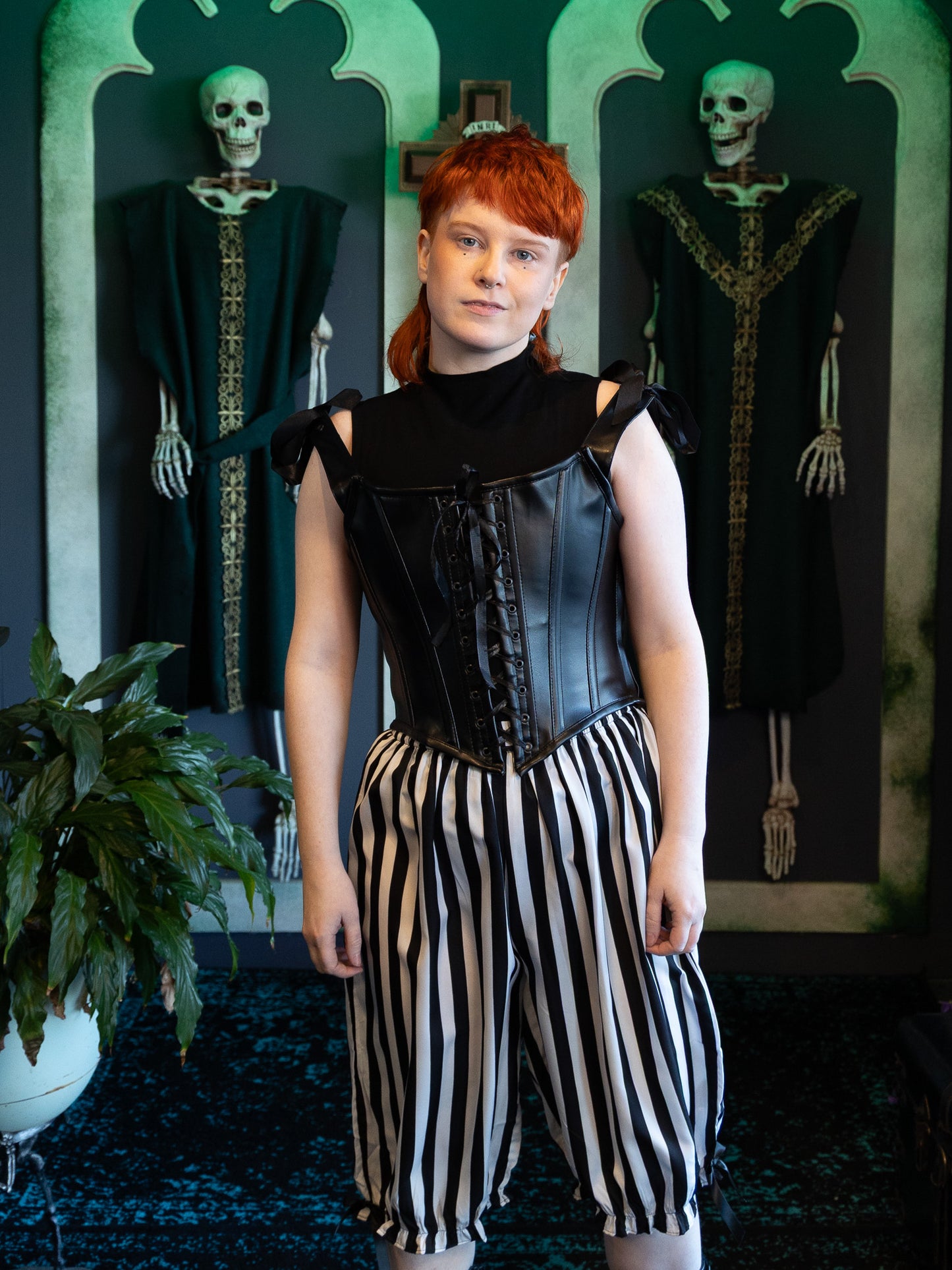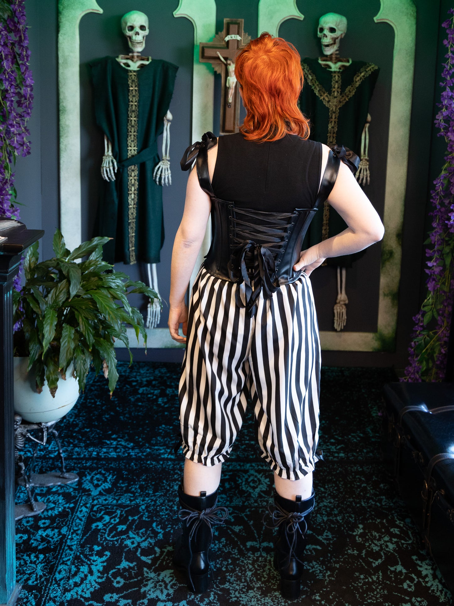Regular price $45.00Make a bold statement with these poly-crepe long striped bloomers, a timeless piece with a playful twist. The vertical stripes elongate the silhouette while keeping the look fun and theatrical. Designed with an elastic waistband for comfort and ribbon-tied hems for adjustability, these bloomers are perfect for costumes, cosplay, festivals, or everyday alternative fashion.