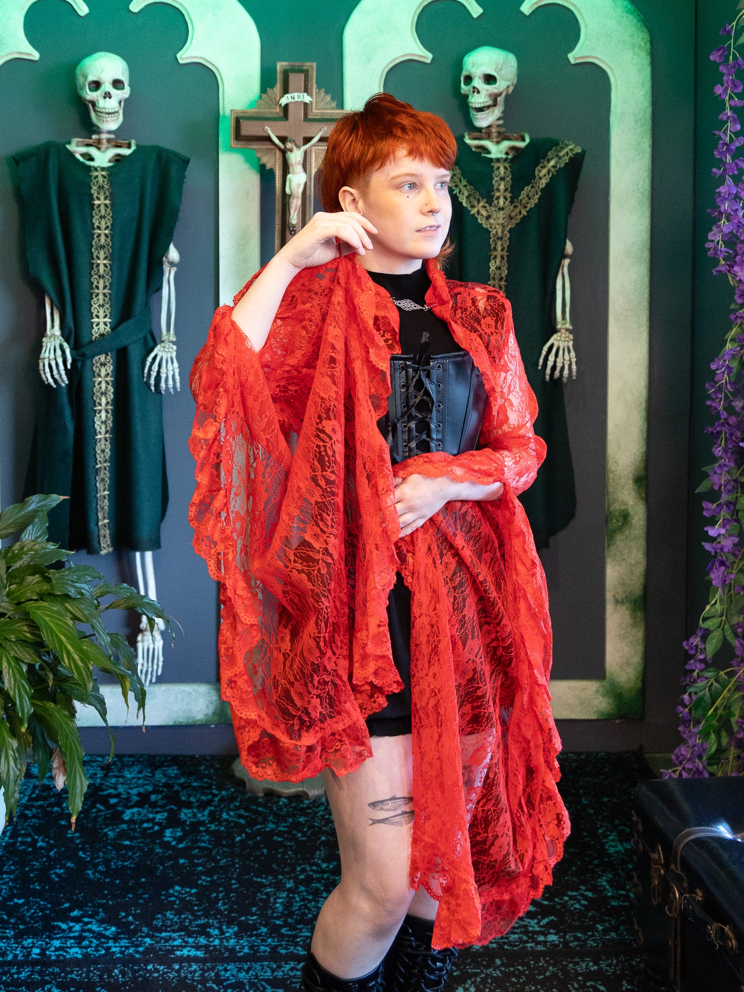 Made from delicate red lace, this bolero jacket features long, dramatic sleeves with a loophole for your finger, adding a touch of elegance and sophistication to any outfit. Perfect for layering, it is versatile and stylish. Wear it open at the neck, or add a shawl clip as styled in the photos.