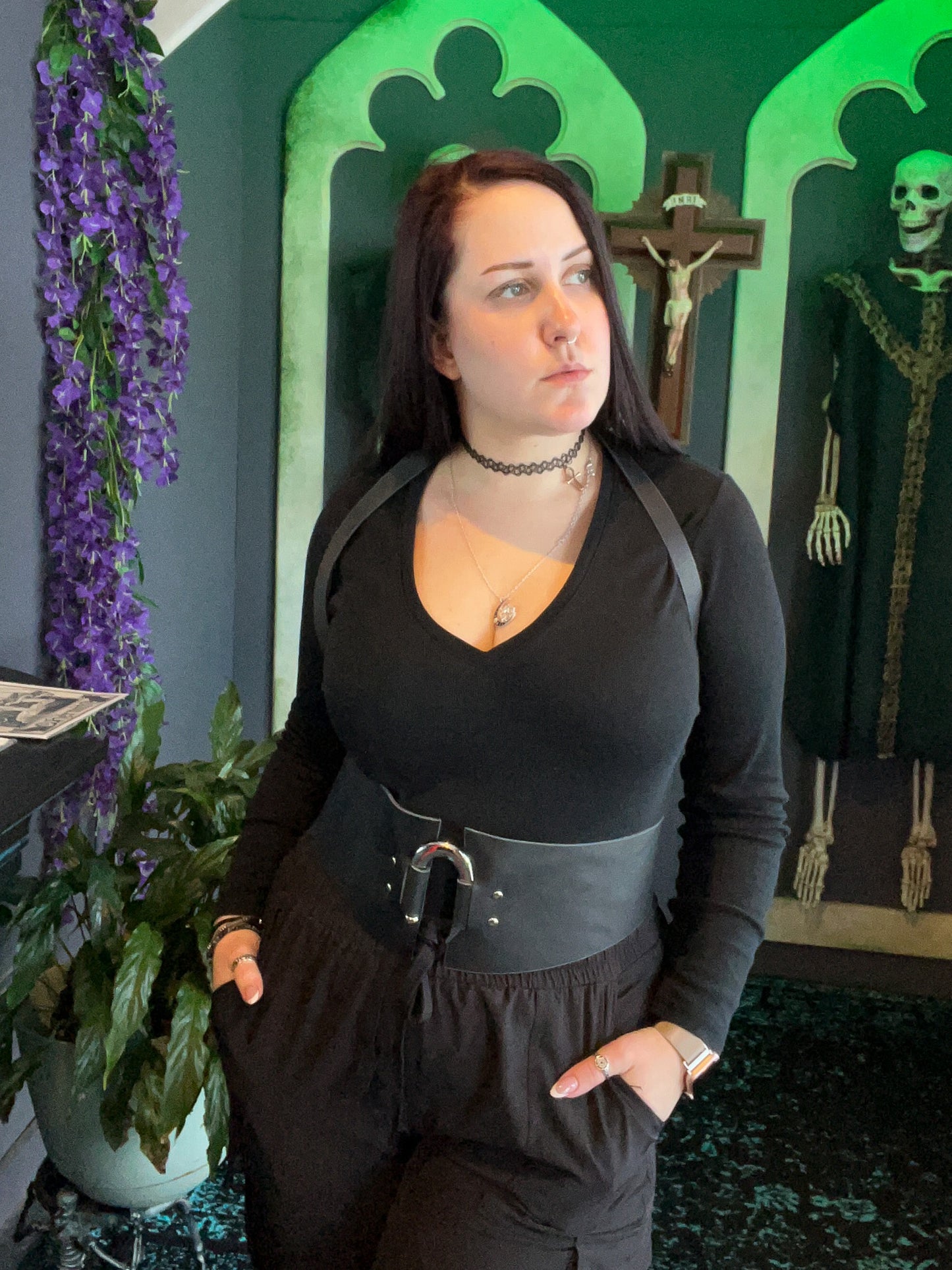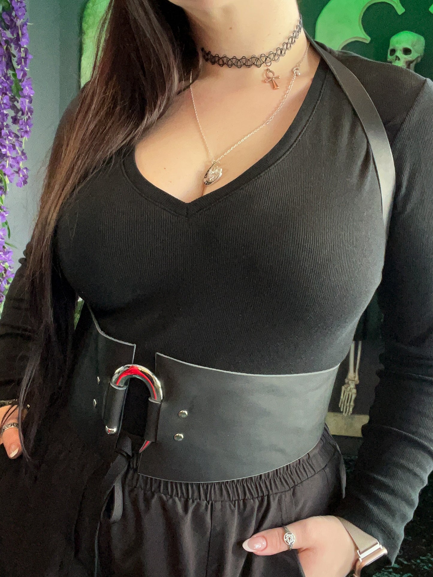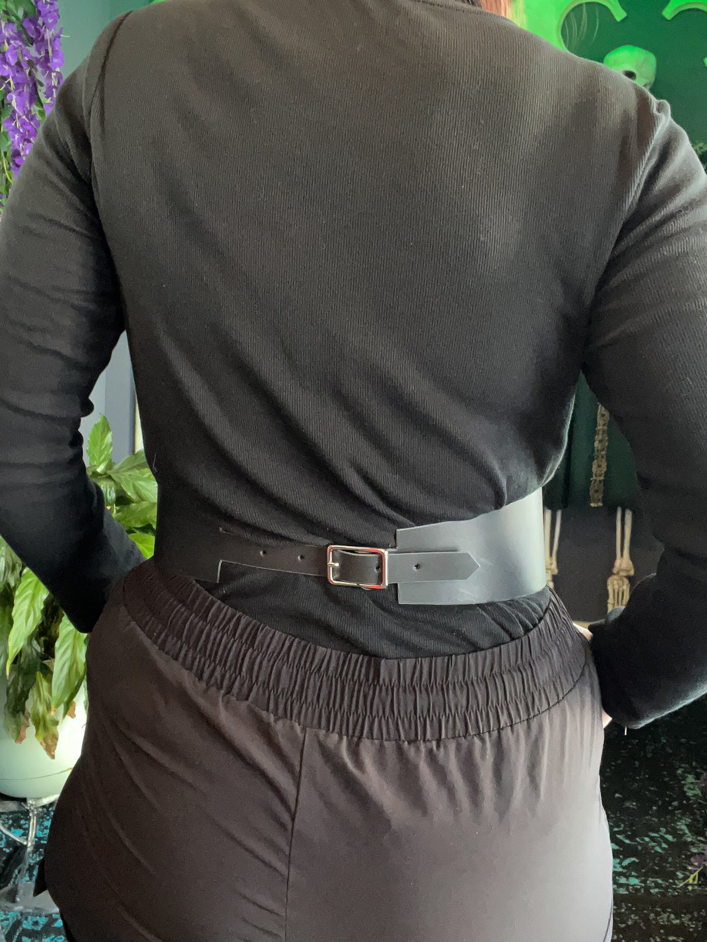 The harness features bold silver hardware with a large hook-shaped piece at the center front, and vegetable-tanned leather from a local New England supplier. A thick belt wraps around the waist, buckling in the back, while a halter strap winds around the shoulders, buckling behind the neck. Both buckled straps are adjustable up and down.