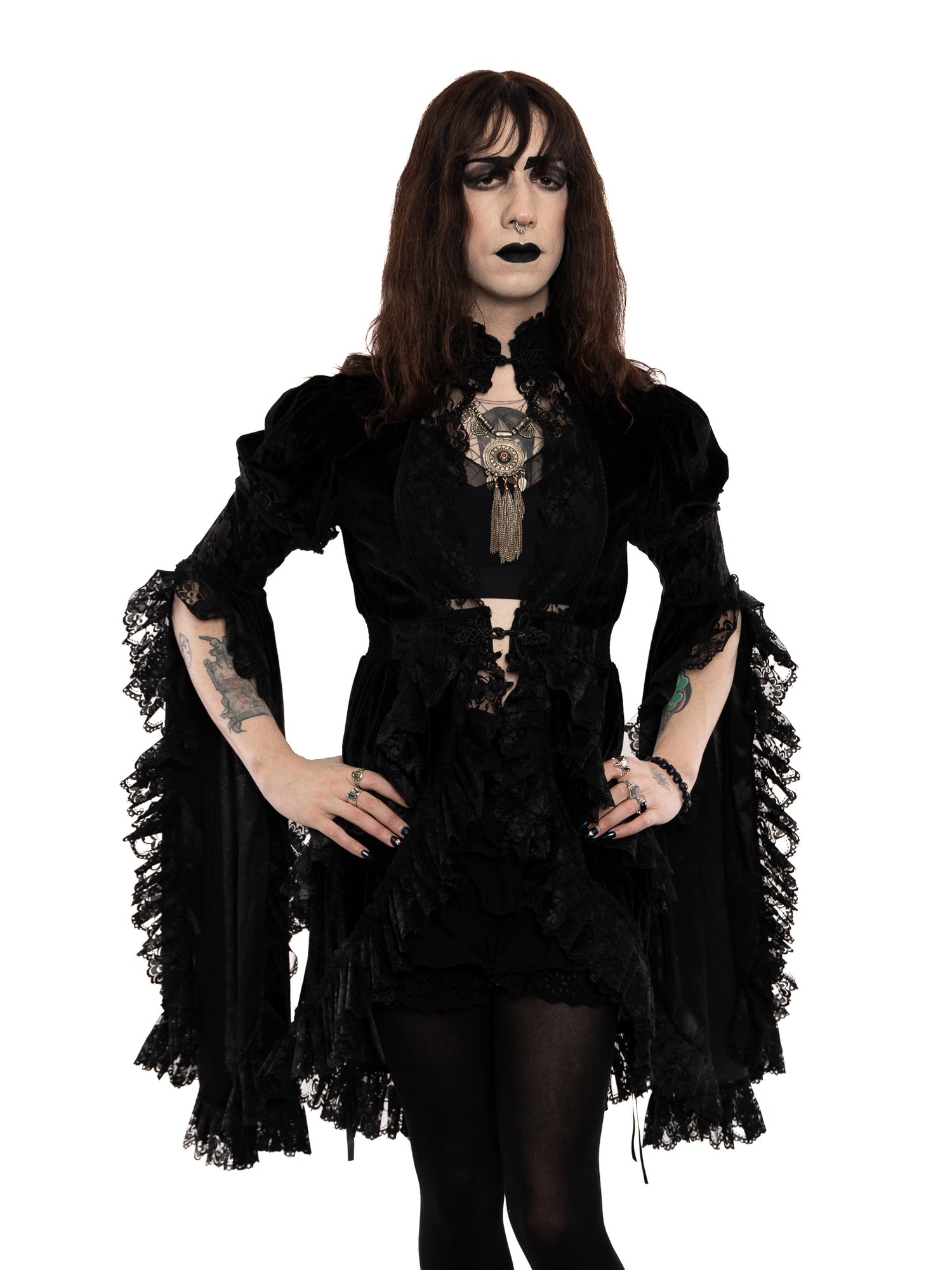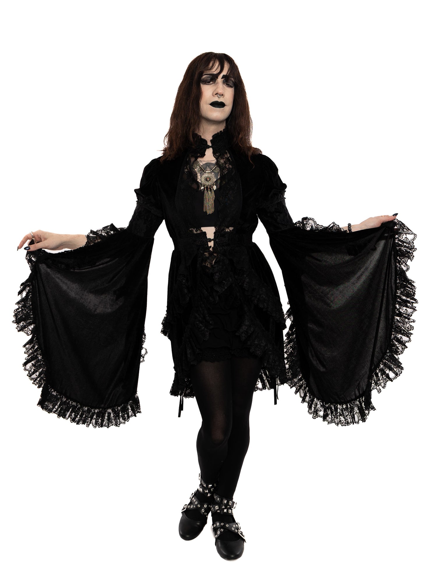 Lydia's signature piece! This dramatic jacket features rich velvet fabric, gorgeous lace embellishments, and dramatic flare sleeves. Frog closures at neck and waist. Elastic waist.